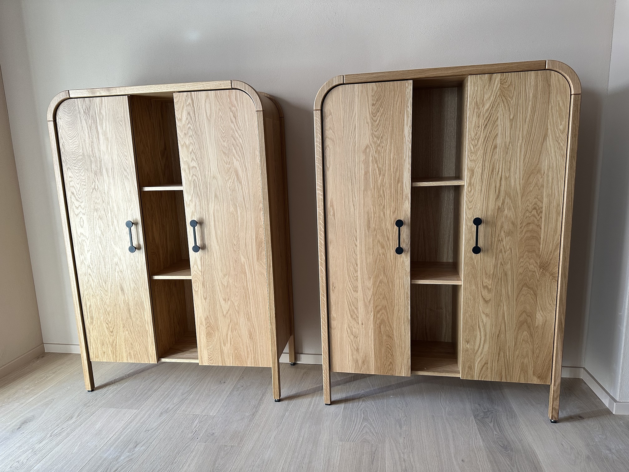 Das Sideboard aus massiver Eiche wurde matt lackiert. Ergänzend dazu fertigten wir zwei freistehende Schränke im gleichen Stil für das Wohnzimmer.