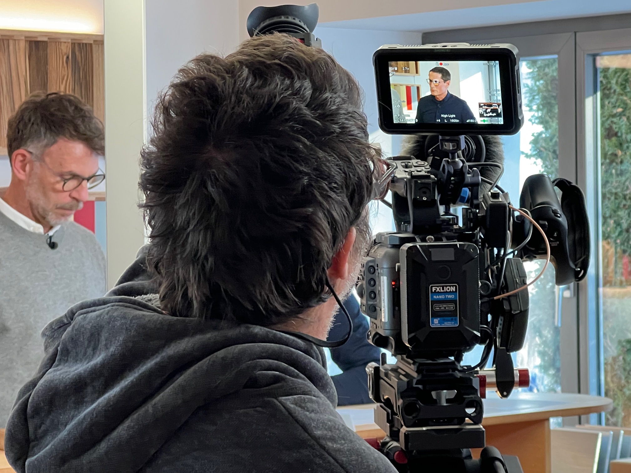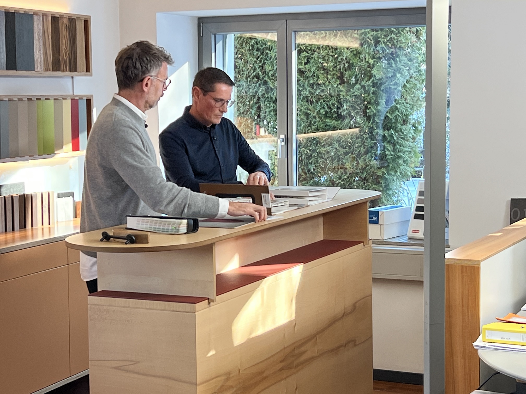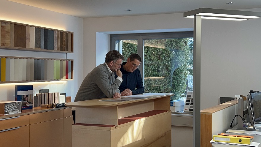 Architekt Andrin Schweizer im Gespräch mit unserem Geschäftsführer Markus Grüter während der Dreharbeiten. Besprechung der Details und der Anforderungen für das Umbauprojekt.