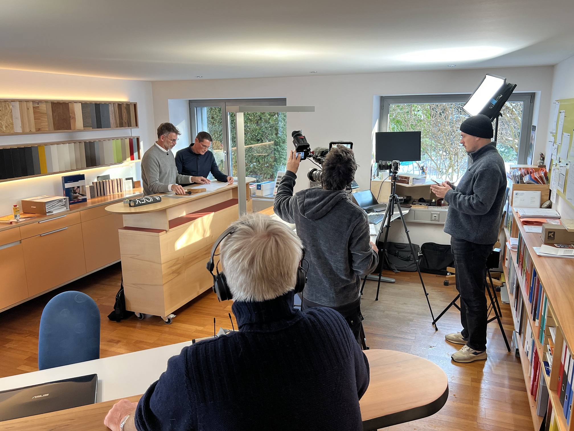 Ein Teil der Dreharbeiten fand direkt in unserer Werkstatt statt. Hier entstanden die Möbelstücke, Einbauregal mit TV Nische und Durchgangsfutter, die später beim Umbau zum Einsatz kamen. Für unser Team war es eine spannende Erfahrung, den gewohnten Arbeitsalltag mit Kameras, Licht und einem Fernsehteam zu teilen.