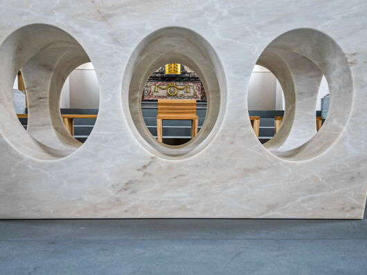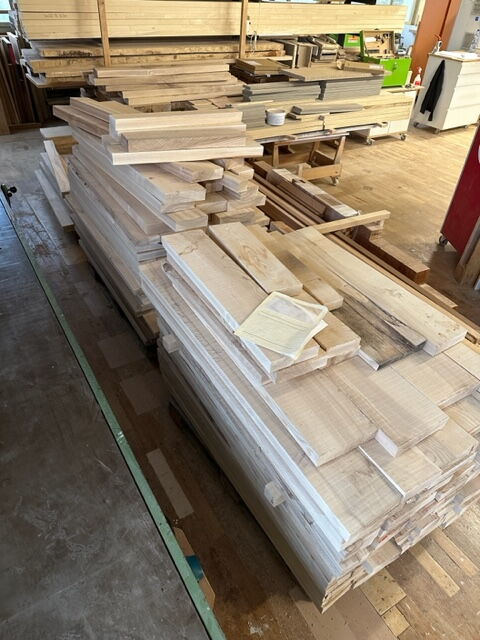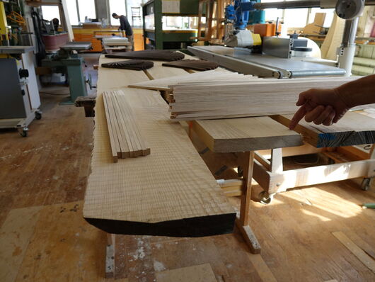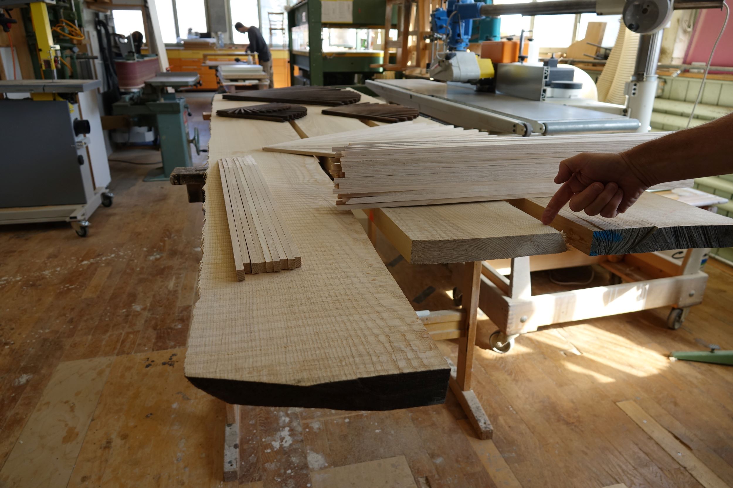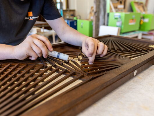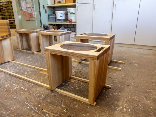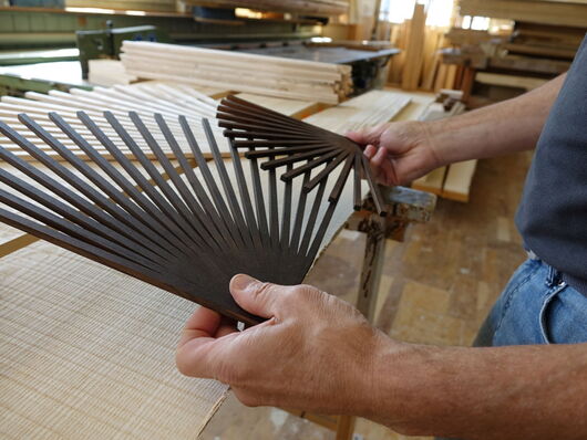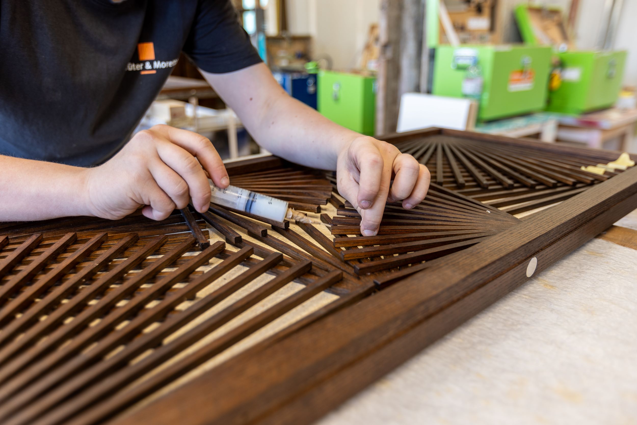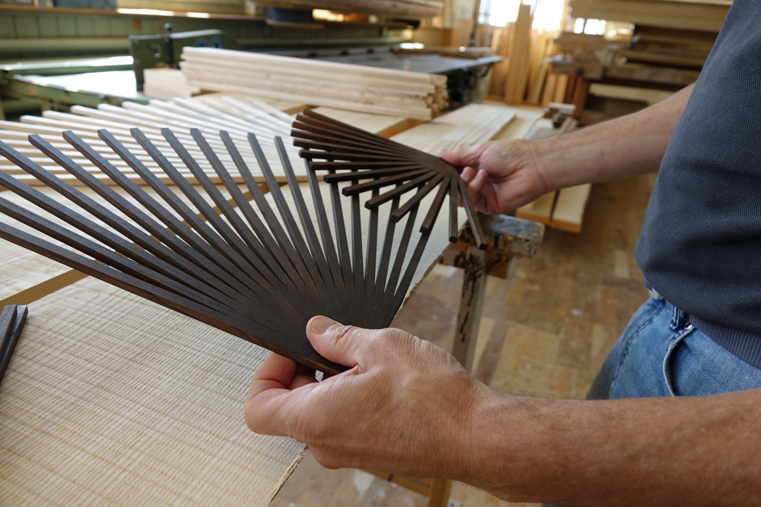 Ja, die Fächerwände waren eine aufwändige Arbeit. Sie bestehen aus 2000 Leisten, ebenfalls aus Kernesche, in verschiedenen Längen und Größen. Wir mussten besonders auf die Jahresringverläufe achten, um Verziehungen zu verhindern. Die Leisten wurden auf der Hobelmaschine zugespitzt, die Oberflächen geschliffen, gebeizt und dann zusammengefügt. Das Design der gesamten Holzarbeiten war vorgegeben, aber wir mussten kreativ sein, um die Qualität und Funktionalität sicherzustellen. Besonders bei den Trennwänden hatte unser Arbeitsvorbereiter, Dominik Schenkel, ausgezeichnete Ideen.