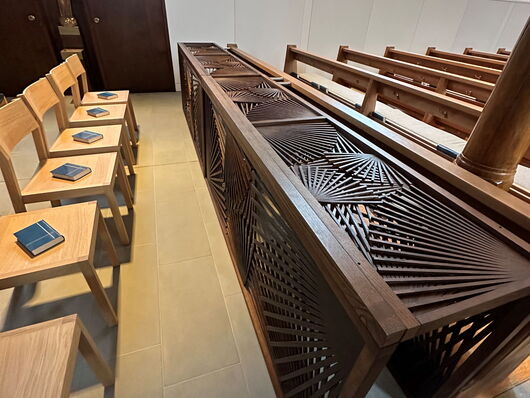 Unsere Aufgaben waren vielfältig. Zunächst haben wir die 20 Kirchenbänke demontiert und aufgefrischt. Das bedeutete, dass wir die Bänke zu uns in den Betrieb transportierten, auseinandernahmen, abschliffen, kürzen und die Oberflächen erneuerten. Die Bänke waren etwa ein Jahr in unserem Betrieb gelagert, bevor wir mit der Bearbeitung beginnen konnten. Darüber hinaus haben wir die Sedilien hergestellt, die Fächerwände als Trennwände und auch die Opferlichttische, Weihwasserspender und die Stelen für die Heiligenstatuen gefertigt.